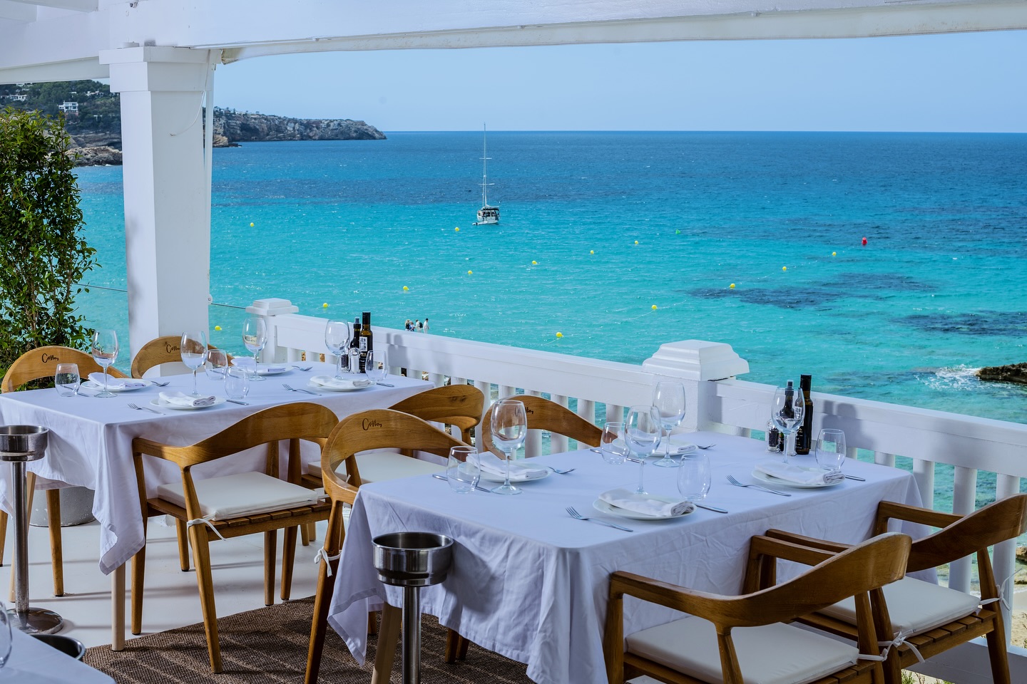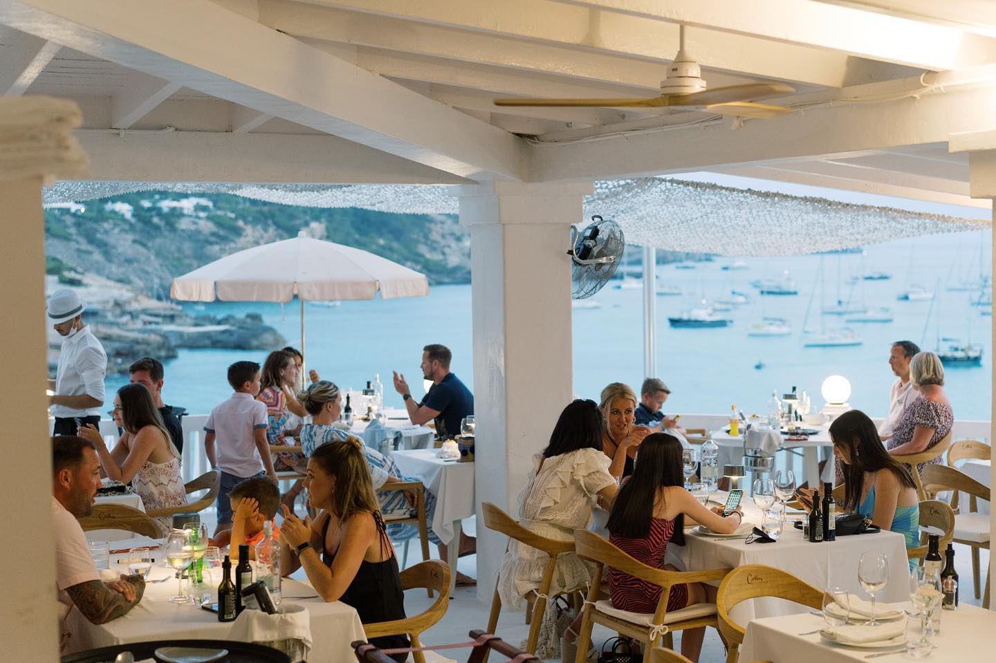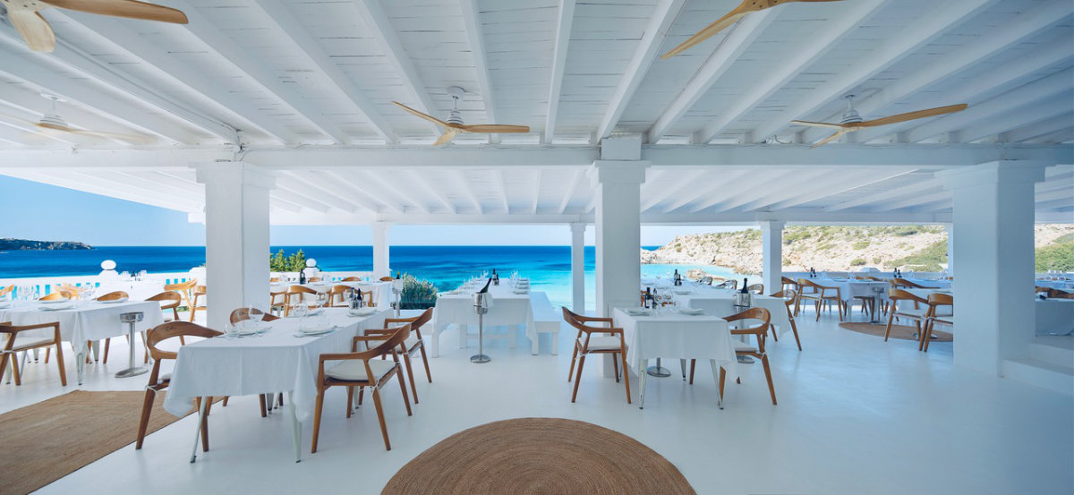 Its chic all-white style, refined cuisine, and breathtaking views over Cala Tarida.