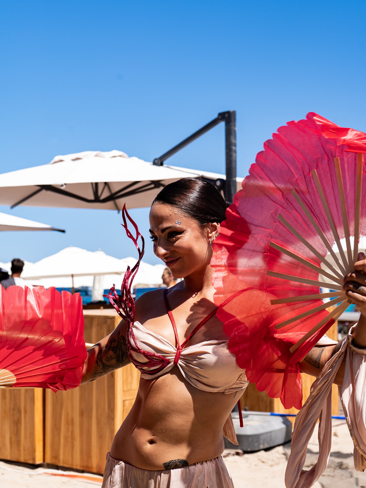 Guests can choose between stylish daybeds right on the beach, shaded dining tables with ocean views, or casual seating areas for light bites and drinks. Smooth Balearic beats from resident DJs add to the laid-back ambiance, creating the perfect balance between relaxation and sophistication.